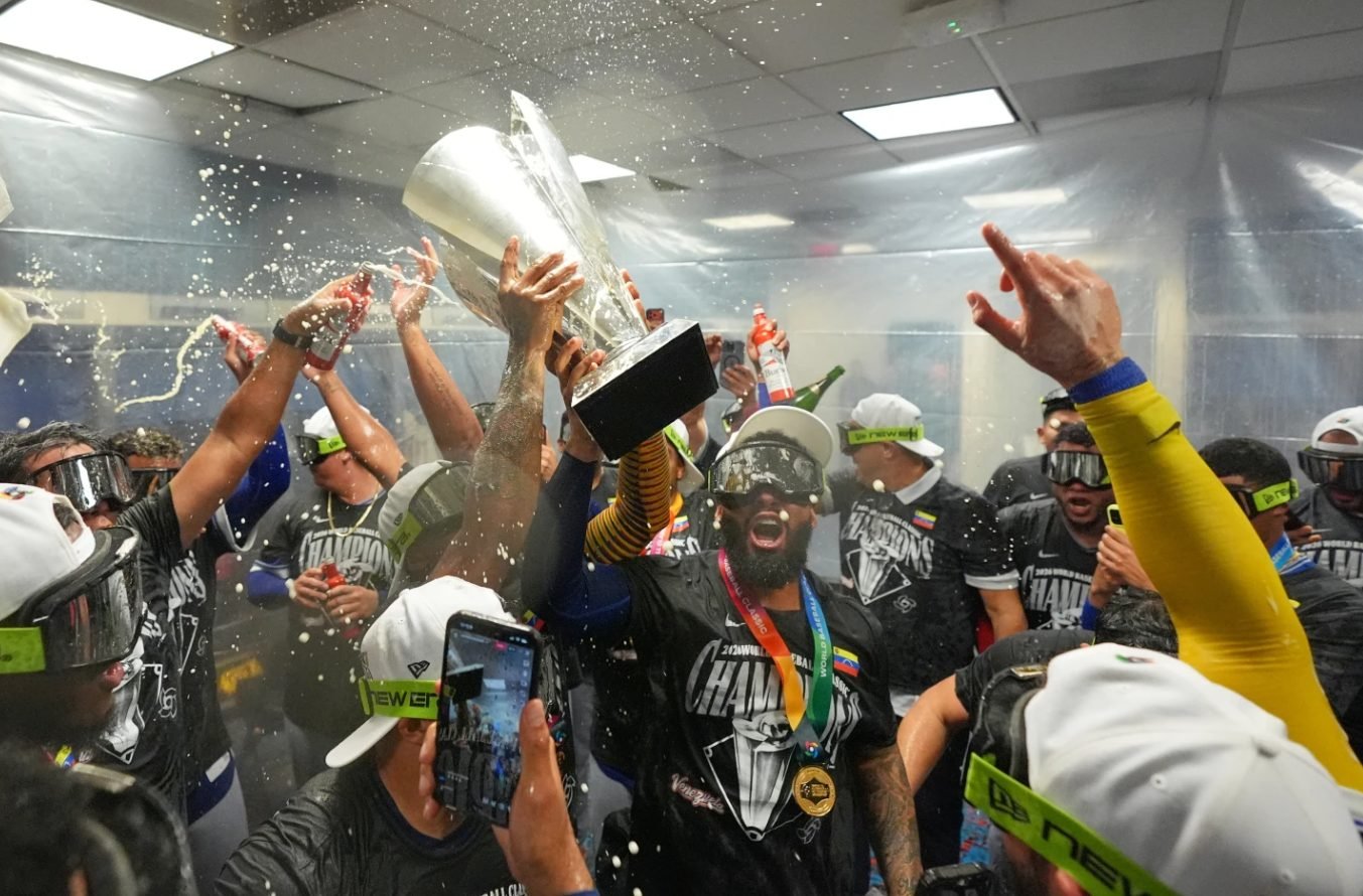 El equipo venezolano celebra con el trofeo del Clásico Mundial de Béisbol 2026. (Foto AP/Rebecca Blackwell)