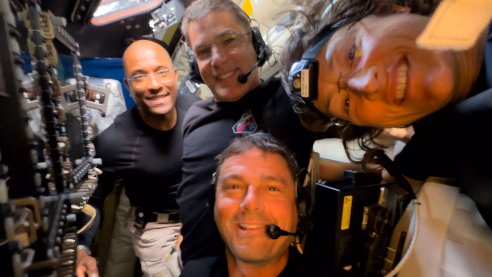 En primer plano aparecía Christina Koch, de perfil; a su lado, el canadiense Jeremy Hansen y, enfrente, el comandante de la misión, Reid Wiseman. Victor Glover estaba un poco fuera de cuadro.