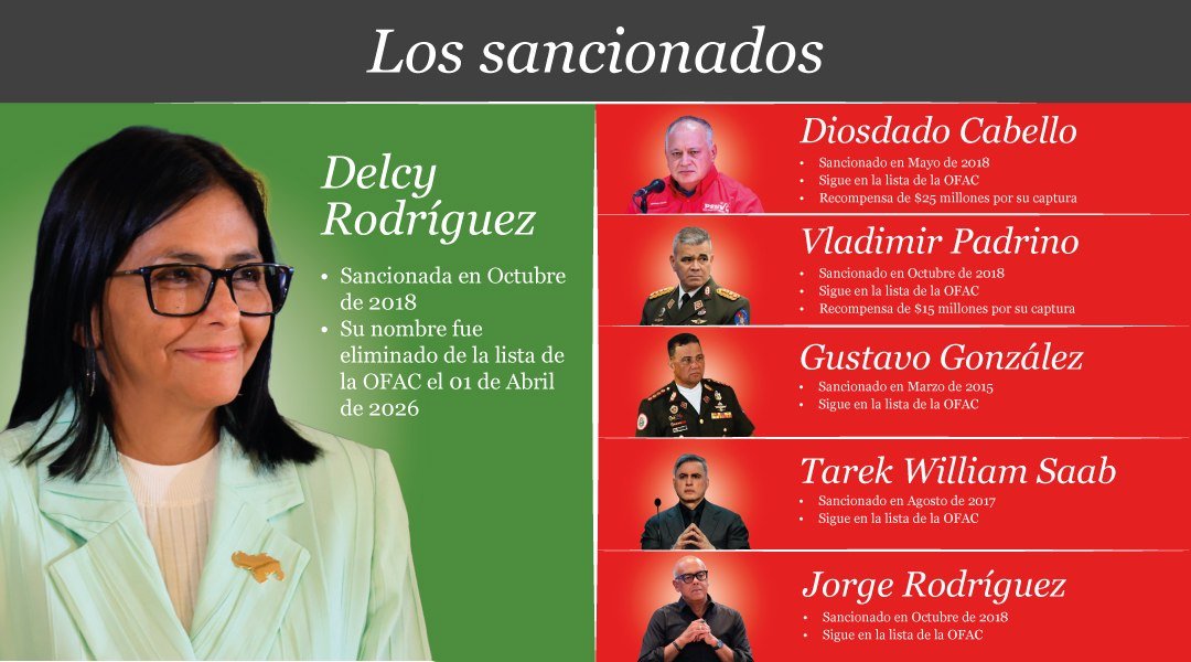 El 1 de abril de 2026, el Departamento del Tesoro de los Estados Unidos actualizó su portal web y eliminó el nombre de Delcy Rodríguez de la Lista de Nacionales Especialmente Designados. Sin comunicado oficial, sin rueda de prensa, sin ceremonia. La SDN —como se conoce por sus siglas en inglés— es la llamada «lista negra» que agrupa a individuos y entidades cuyos activos están bloqueados y con quienes los ciudadanos estadounidenses tienen prohibido realizar cualquier tipo de transacción comercial o financiera. Una línea borrada en una base de datos gubernamental que, sin embargo, reconfigura el mapa de poder en Venezuela y envía una señal precisa al resto del continente.