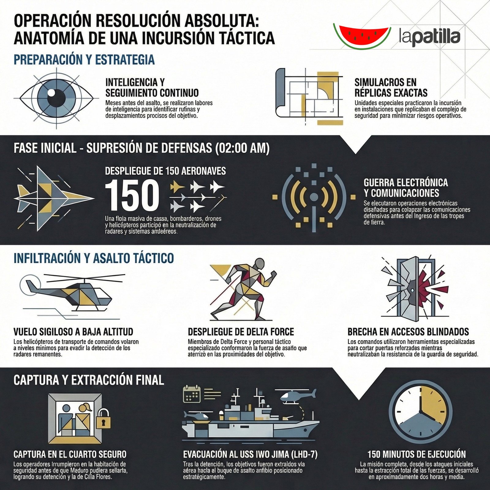 La reconstrucción concluye que “la operación combinó superioridad aérea, guerra electrónica e infiltración de fuerzas especiales para alcanzar su objetivo en un tiempo limitado”.