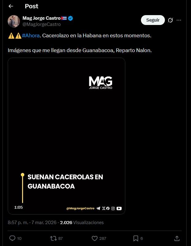 A través de redes sociales, el periodista Mag Jorge Castro reportó un intenso cacerolazo en Guanabacoa, específicamente en el Reparto Nalón, como respuesta a la crisis energética que mantiene a gran parte de la isla a oscuras desde el pasado miércoles.
