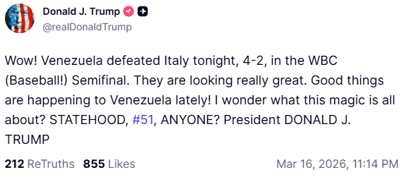 «¡Wow! Venezuela derrotó a Italia esta noche, 4-2, en la Semifinal del CMB (¡Béisbol!). Se ven realmente geniales. ¡Cosas buenas le pasan a Venezuela últimamente! Me pregunto de qué se trata toda esta magia. ESTADIDAD #51, ¿ALGUIEN?», escribió el mandatario.