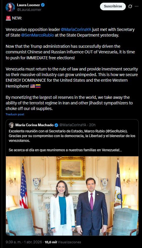 A través de su cuenta en X, Loomer destacó el encuentro celebrado este martes 31 de marzo en la sede del Departamento de Estado y aseguró que, tras lo que calificó como el desplazamiento de la influencia china y rusa en Venezuela, el siguiente paso debe ser el restablecimiento del estado de derecho y la convocatoria de elecciones libres.
