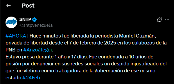 En una tarde marcada por el alivio y la emoción, este martes 24 de febrero se confirmó la liberación de la periodista venezolana Marifel Guzmán. La comunicadora se encontraba privada de su libertad desde el pasado 7 de febrero de 2025, tras una condena que despertó el rechazo de gremios nacionales e internacionales.