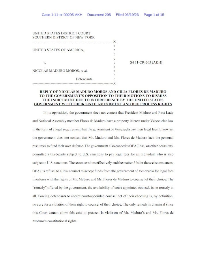 -“La ley venezolana otorga al Sr. Maduro y a la Sra. Flores de Maduro un derecho de propiedad sobre el pago de sus honorarios legales. La revocación de las Licencias Originales por parte de la OFAC y la negativa a restablecerlas interfiere con su derecho a contratar al abogado de su elección ya que, sin la capacidad de ejercer este derecho de propiedad, ninguno de los dos tiene la capacidad de financiar la defensa por sí mismos. Ver Declaración. de Nicolás Maduro Moros (ECF No. 290-2) y Declaración. de Cilia Flores de Maduro (ECF No. 293-2) (declaraciones juradas de incapacidad de pago y disposición a presentar declaraciones financieras a petición de la Corte)”, afirma Pollack en la foja 4 de su presentación.
