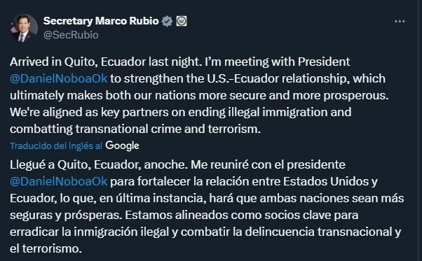 “Me reuniré con el presidente Daniel Noboa para fortalecer la relación entre Estados Unidos y Ecuador, lo que, en última instancia, hará que ambas naciones sean más seguras y prósperas”, publicó el funcionario estadounidense a través de su cuenta en X.