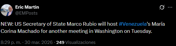 La información fue dada a conocer la tarde de este lunes 30 de marzo a través de la red social X por Eric Martin, reportero de la agencia de noticias Bloomberg asignado a la cobertura del Departamento de Estado. En su publicación, el periodista confirmó el inminente cara a cara entre ambos líderes en la capital estadounidense.