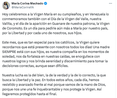 A través de su cuenta en X, Machado hizo una reflexión sobre la fe y el papel de la Virgen María como guía y protectora. “Hoy celebremos a la Virgen María en su cumpleaños, y en Venezuela lo conmemoramos también con el Día de la Virgen del Valle, nuestra Vallita, y el día de la aparición en Guanare de nuestra patrona, la Virgen de Coromoto”, escribió.