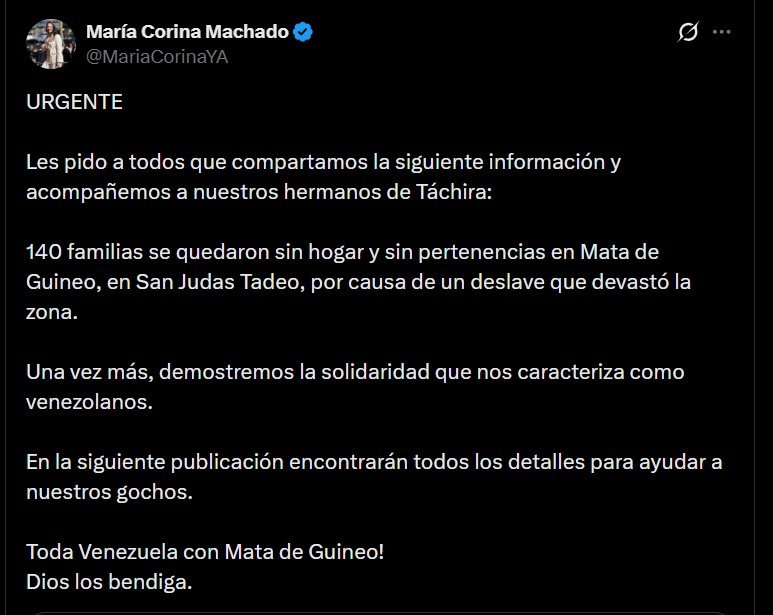 Machado, quien se encuentra fuera de Venezuela, pidió a la población demostrar su «solidaridad» para apoyar a estas familias, a la par que compartió un mensaje con información sobre los centros de acopio que ha instalado su partido, Vente Venezuela (VV), para recopilar insumos como alimentos no perecederos, agua potable, mantas y colchones, así como ropa.