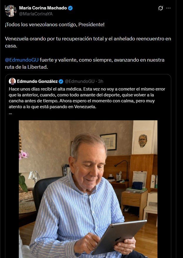 A través de sus redes sociales, Machado envió un mensaje de respaldo al dirigente opositor, quien horas antes aseguró que ya recibió el alta médica y que se encuentra nuevamente activo.