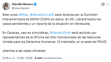 Según informó su vocera, Claudia Macero, la dirigente presentará un reporte actualizado sobre la crisis en Venezuela y expondrá todos los casos pendientes en materia de vulneraciones de DDHH ante el organismo interamericano.