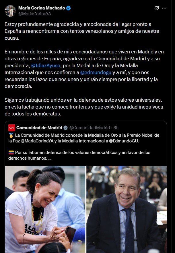 A través de un mensaje publicado en su cuenta en la red social X, Machado aseguró sentirse “profundamente agradecida y emocionada” por su próximo viaje a España, donde prevé reencontrarse con la diáspora venezolana y con aliados de la causa democrática.