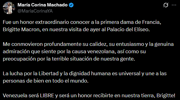 «Fue un honor extraordinario conocer a la primera dama de Francia, Brigitte Macron, en nuestra visita de ayer al Palacio del Elíseo», comentó Machado en redes sociales después de encontrarse también con Emmanuel Macron, presidente francés.