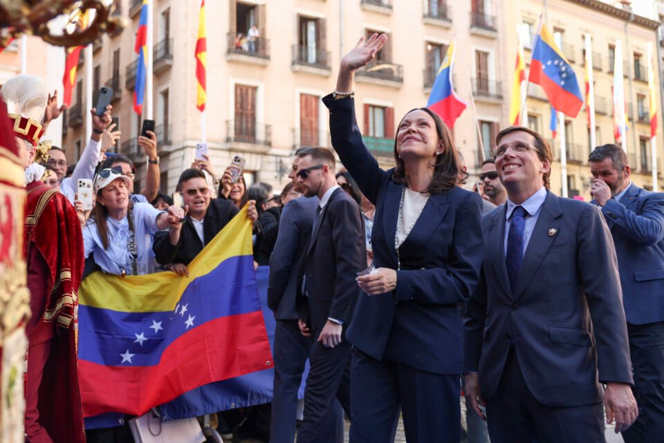 Al tomar el micrófono, Machado recibió palabras de aliento que la conmovieron y decidió interrumpir un segundo su declaración junto al alcalde madrileño, José Luis Martínez-Almeida, para honrar la valentía de sus paisanos criollos.