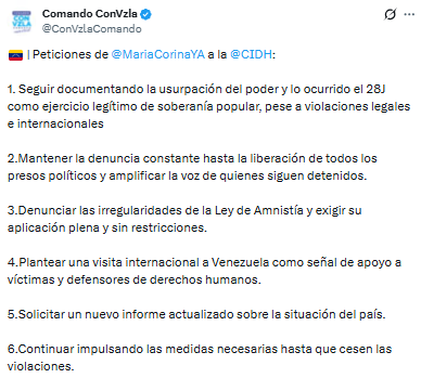 Machado presentó una serie de peticiones a los miembros de la Comisión y entre los puntos destacados, se solicita al organismo continuar documentando la usurpación del poder tras los eventos del 28 de julio, mantener la presión internacional hasta lograr la liberación de todos los presos políticos y denunciar las irregularidades en torno a la Ley de Amnistía, exigiendo su aplicación plena y sin las restricciones discrecionales que el Estado ha impuesto recientemente.