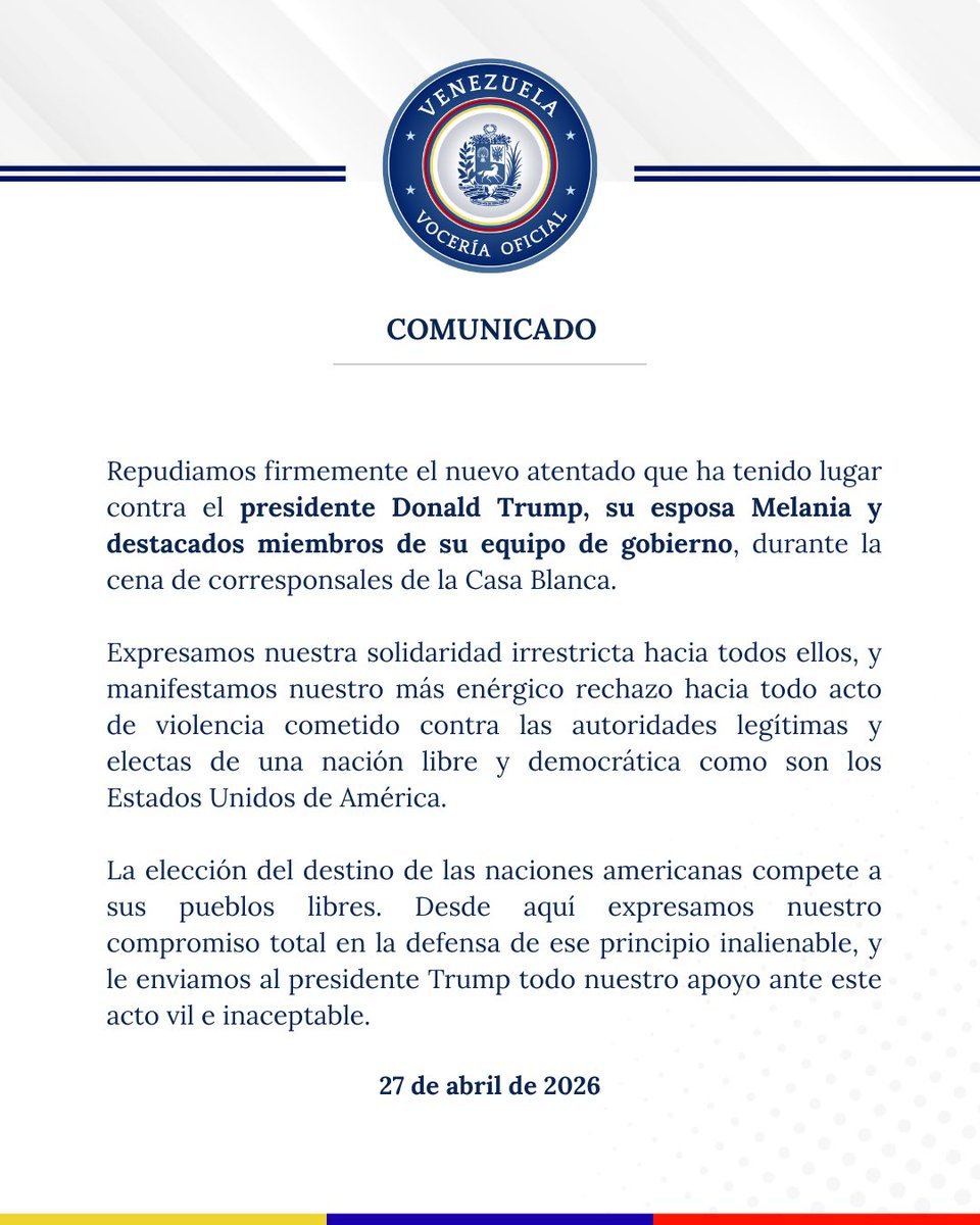 La vocería oficial del líder opositor, Edmundo González y la Premio Nobel de la Paz, María Corina Machado,  expresó este lunes su rechazo al atentado ocurrido contra el presidente de Estados Unidos, Donald Trump, durante la cena de corresponsales de la Casa Blanca en Washington.