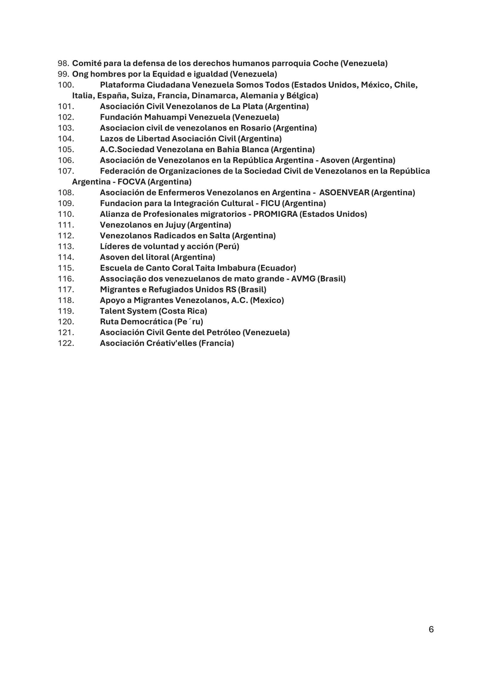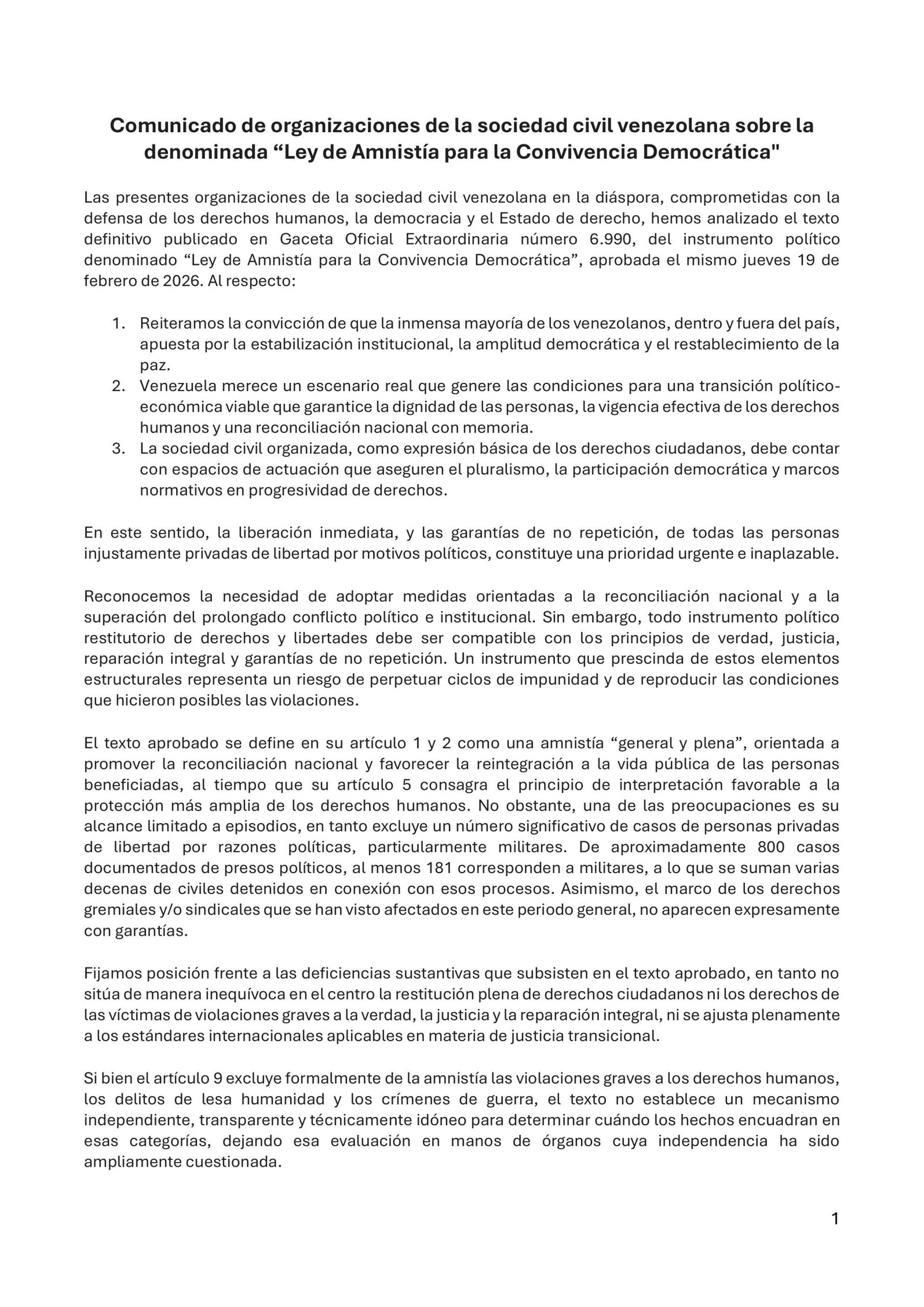 Finalmente, las ONG exigieron el cese inmediato de la persecución política y la liberación de todas las personas detenidas injustamente. “La verdadera convivencia democrática no se construye con un perdón otorgado por el victimario sin reconocimiento de la falta, sino mediante un proceso integral en el que el Estado rinda cuentas y las víctimas sean resarcidas”, concluye el comunicado.