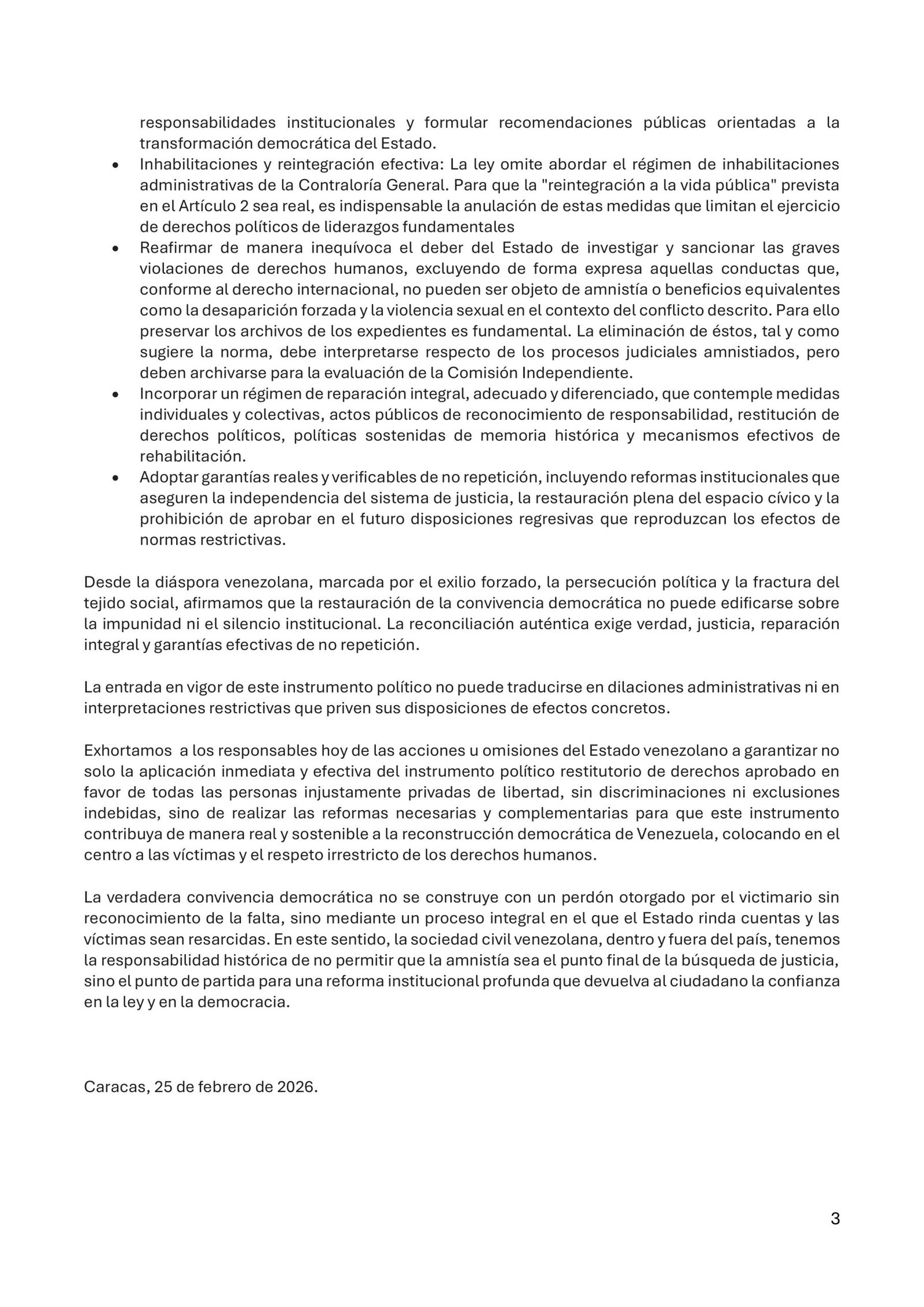Las organizaciones instaron a las autoridades a adoptar reformas complementarias que incluyan la creación de una Comisión de la Verdad independiente; la anulación de inhabilitaciones políticas; un sistema integral de reparación para las víctimas; y reformas institucionales que garanticen la independencia judicial y el cese de la criminalización de la disidencia.