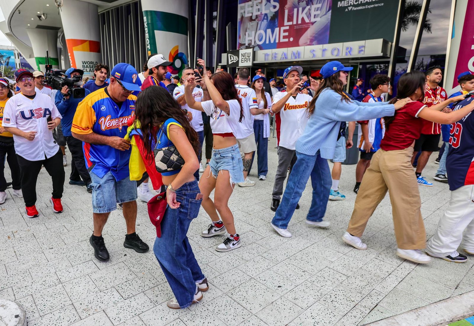 MIAMI (Estados Unidos), 18/03/2026.- Personas celebran afuera del estadio antes del inicio de la final del Clásico Mundial de Béisbol 2026 entre Estados Unidos y Venezuela en el estadio de béisbol LoanDepot Park en Miami, Florida, Estados Unidos, 17 de marzo de 2026. EFE/EPA/CRISTÓBAL HERRERA-ULASHKEVICH