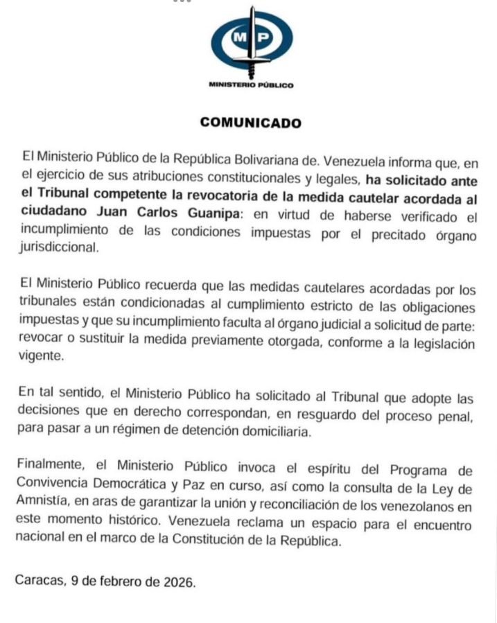 El Ministerio Público (MP) venezolano informó en un abrupto comunicado emitido durante la madrugada del lunes que el líder opositor Juan Pablo Guanipa será sometido a prisión domiciliaria, aunque su familia desconoce actualmente su paradero luego de que hombres armados vestidos de civil lo secuestraran en las adyacencias de su casa en Los Chorros, estado Miranda, tan solo horas después de su celebrada excarcelación.