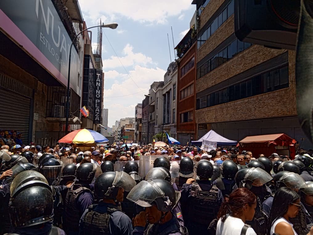 Un tenso momento quedó grabado este jueves durante la marcha de trabajadores hacia Miraflores, cuando un funcionario de la Policía Nacional Bolivariana persiguió a uno de los manifestantes que había logrado romper un piquete en el centro de Caracas.