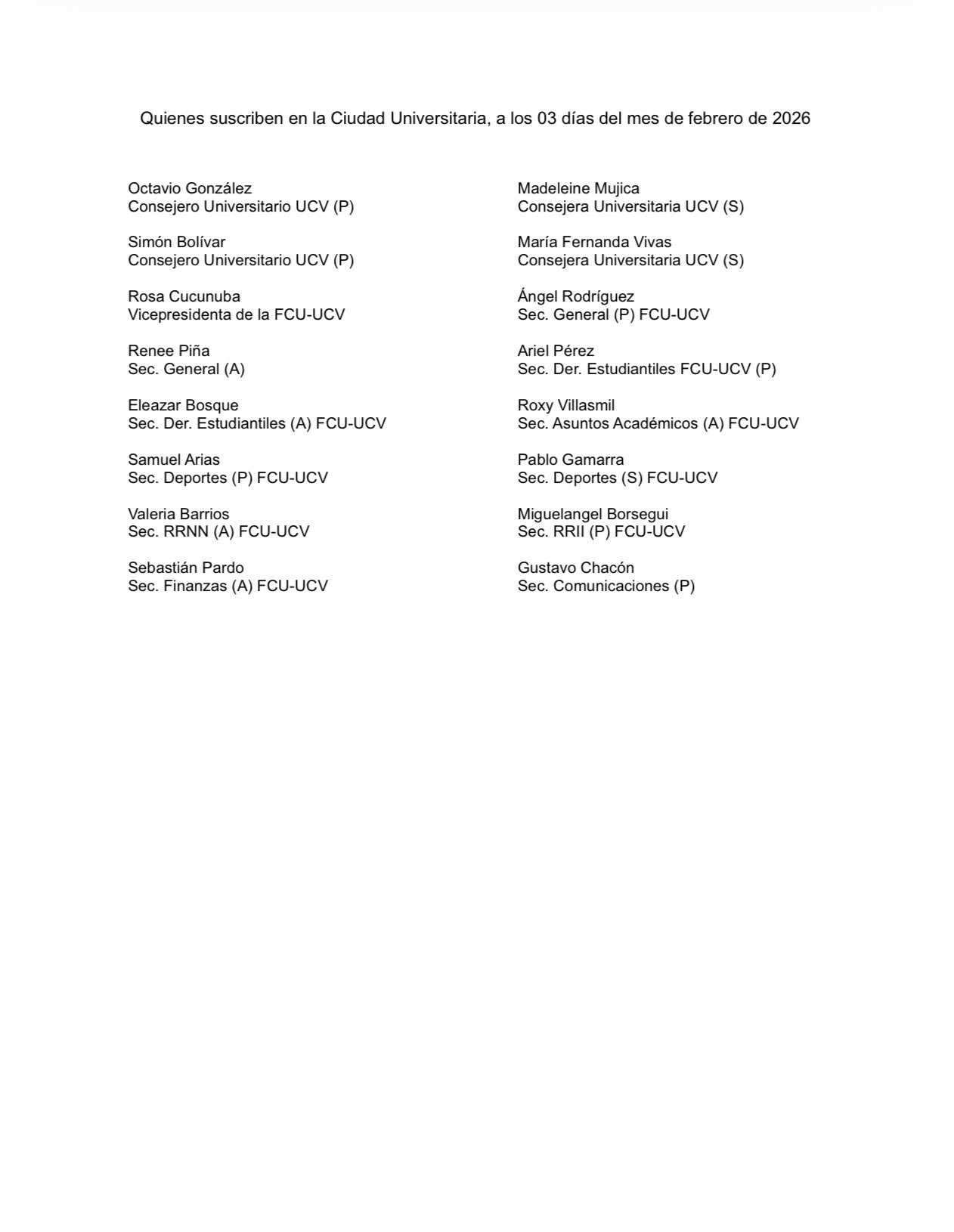 «La Universidad Venezolana alza su voz del lado de la gente, para construir un país acorde con los valores democráticos», dicta el cierre del documento firmado por representantes de la FCU-UCV y Consejeros Universitarios.