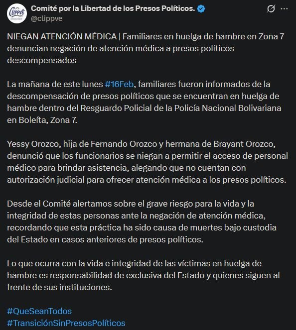Según el Clippve, los familiares fueron informados la mañana de este lunes 16 de febrero sobre la descompensación de los detenidos que mantienen la huelga de hambre desde el viernes al mediodía. La organización alertó sobre el “grave riesgo para la vida e integridad” de estas personas ante la negativa de atención médica.
