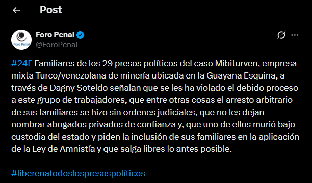 A través de su cuenta oficial en X, la organización compartió el testimonio de Dagny Soteldo, familiar de uno de los detenidos, quien aseguró que sus parientes fueron arrestados sin orden judicial y sin que se les haya garantizado el derecho a la defensa.