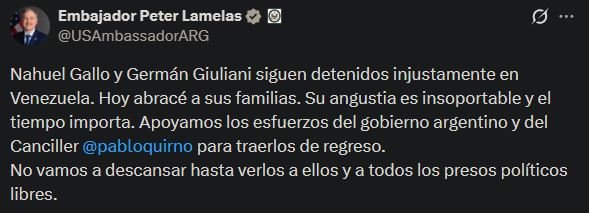 “Nahuel Gallo y Germán Giuliani siguen detenidos injustamente en Venezuela. Hoy abracé a sus familias. Su angustia es insoportable y el tiempo importa. Apoyamos los esfuerzos del gobierno argentino y del canciller Pablo Quirno para traerlos de regreso. No vamos a descansar hasta verlos a ellos y a todos los presos políticos libres”, escribió.