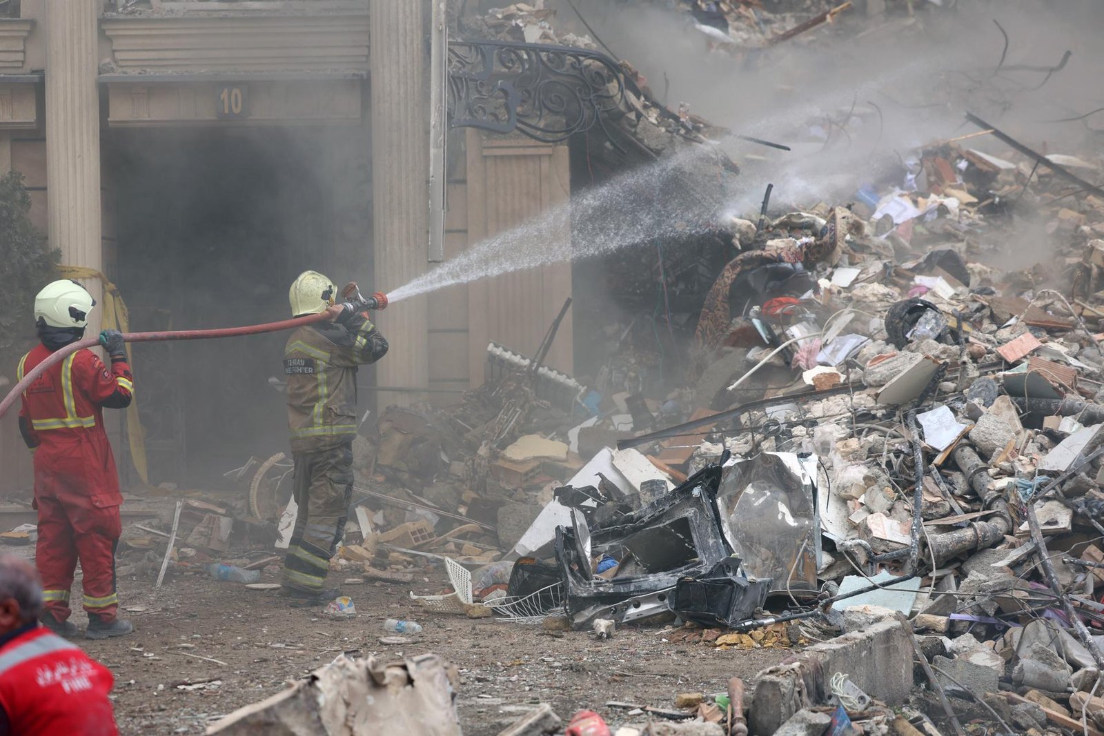 Bomberos y funcionarios iraníes trabajan en el lugar de los edificios residenciales dañados en el norte de Teherán, Irán, el 23 de marzo de 2026. EFE/EPA/ABEDIN TAHERKENAREH