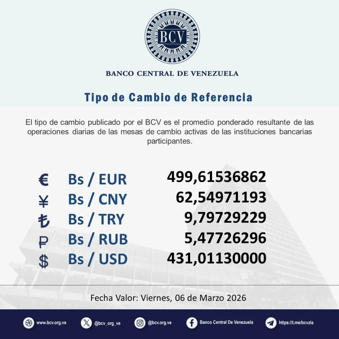 El Banco Central de Venezuela (BCV) anunció este jueves un nuevo ajuste en el tipo de cambio oficial, vigente hasta el viernes 6 de marzo.
