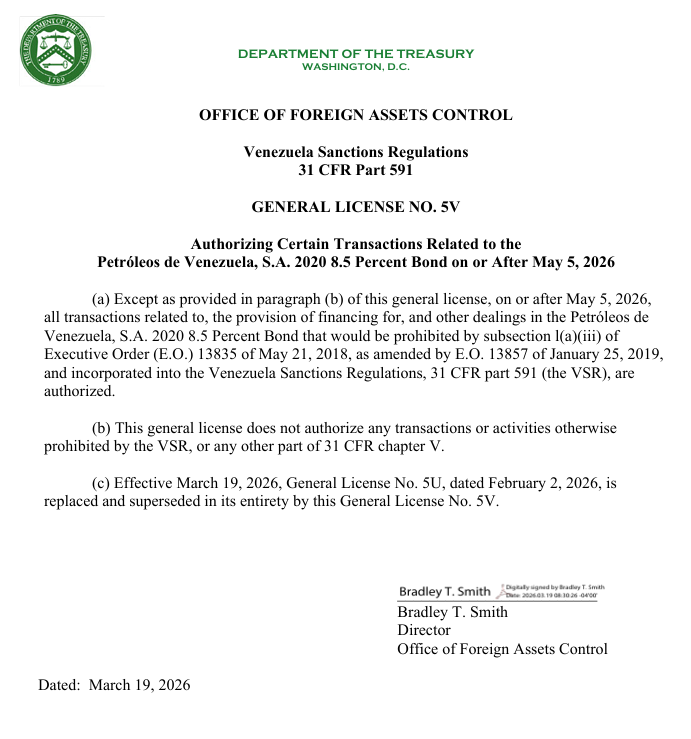 (c) Con efecto a partir del 19 de marzo de 2026, la Licencia General n.º 5U, de fecha 2 de febrero de 2026, queda sustituida y derogada en su totalidad por la presente Licencia General n.º 5V.»