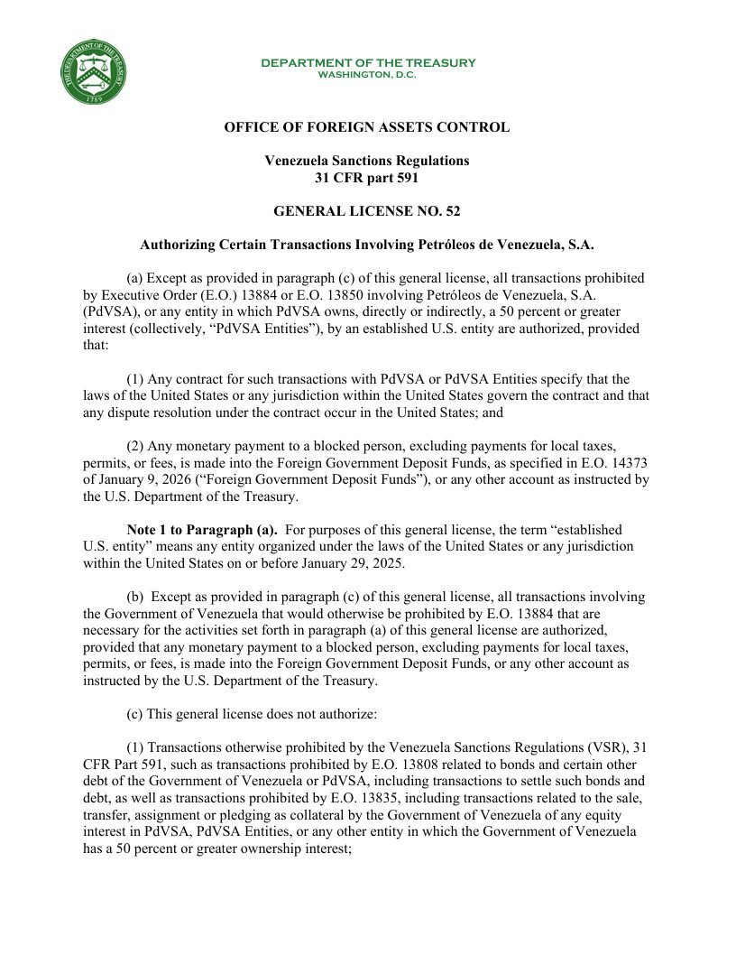 La Oficina de Control de Activos Extranjeros (Ofac, por sus siglas en inglés) emitió este miércoles la Licencia General 52 que flexibiliza algunas transacciones prohibidas previamente para facilitar la interacción entre empresas estadounidenses ya establecidas en territorio venezolano y la estatal Pdvsa, así como con otras entidades mixtas locales.