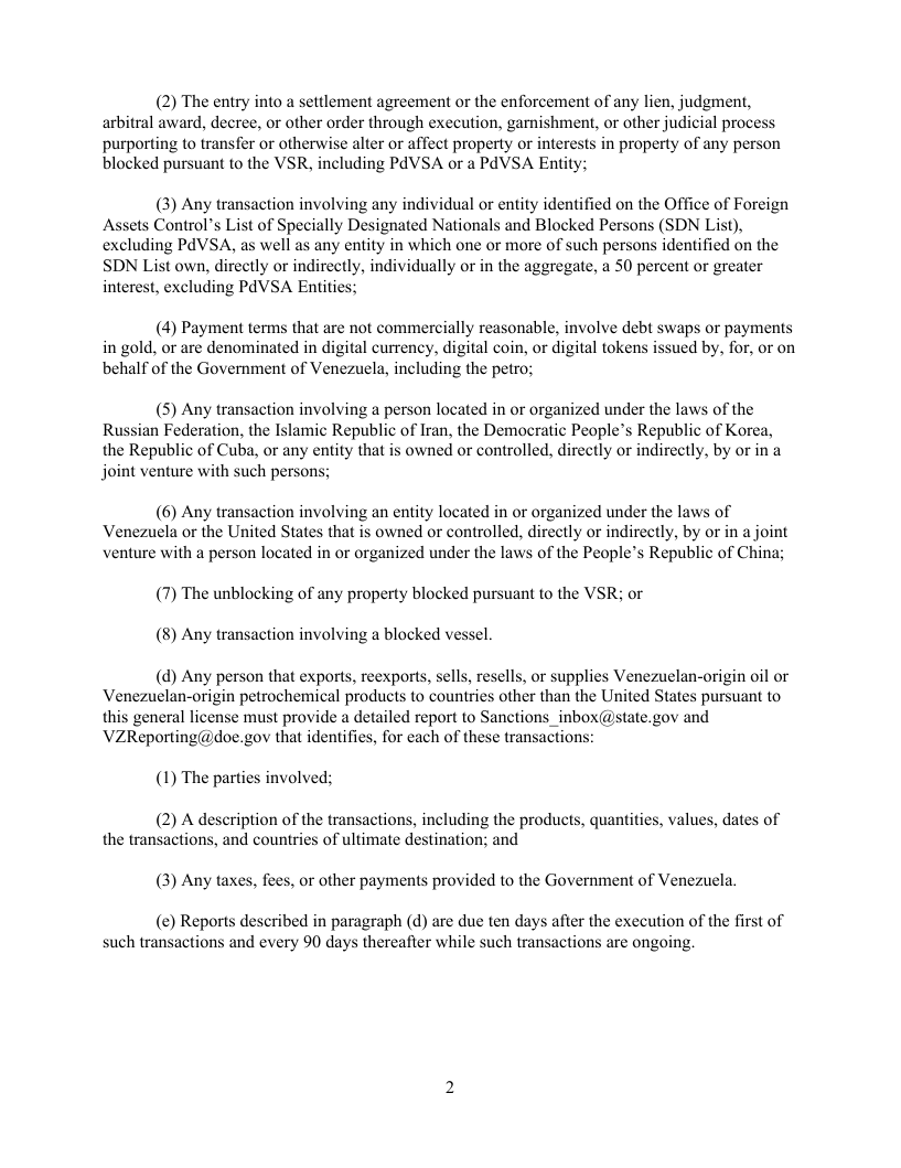 Las exclusiones no autorizan transacciones prohibidas por otras regulaciones como las relacionadas con bonos o deudas específicas de Venezuela o Pdvsa; ni acuerdos de liquidación, ejecución de gravámenes o procesos judiciales que afecten propiedades bloqueadas; ni transacciones con personas o entidades sancionadas, excluyendo Pdvsa; ni pagos en oro o criptomonedas emitidas por el chavismo, como el Petro; ni transacciones con personas o entidades de Rusia, Irán, Corea del Norte, Cuba, o China; ni el desbloqueo de propiedades bloqueadas o transacciones con buques bloqueados.
