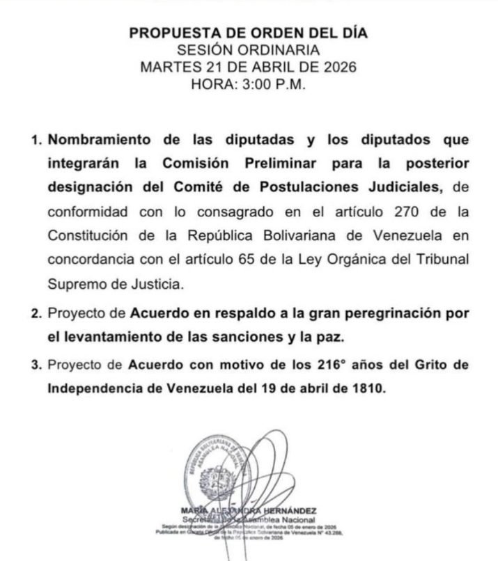 En la propuesta de orden del día de este martes se incluyó el «nombramiento de las diputadas y los diputados que integrarán la Comisión Preliminar para la posterior designación del Comité de Postulaciones Judiciales».