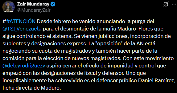 Al respecto, el abogado Zair Mundaray, recordó en redes sociales que «desde febrero he venido anunciando la purga del TSJ para el desmontaje de la mafia Maduro-Flores que sigue controlando el sistema».