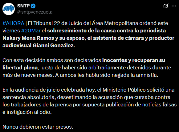 El Tribunal 22 de Juicio del Área Metropolitana ordenó este viernes 20 de marzo el sobreseimiento de la causa contra la periodista Nakary Mena Ramos y su esposo, el asistente de cámara y productor audiovisual Gianni González, informó el Sindicato Nacional de Trabajadores de la Prensa (SNTP).