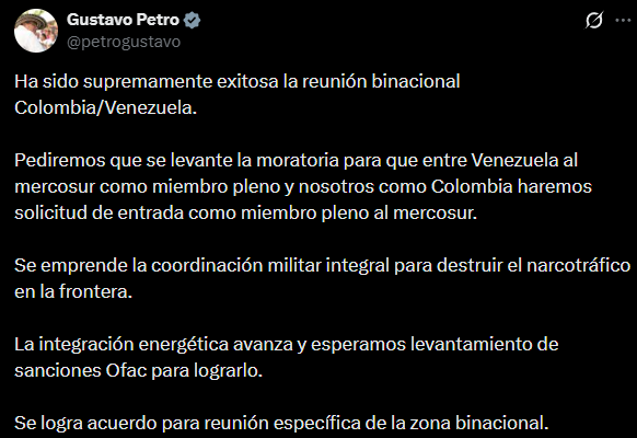«Pediremos que se levante la moratoria para que entre Venezuela al Mercosur como miembro pleno y nosotros como Colombia haremos solicitud de entrada como miembro pleno al Mercosur», manifestó Petro en un mensaje en su cuenta de X.