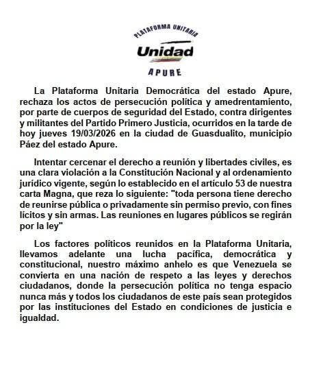 La Plataforma Unitaria Democrática del estado Apure emitió un comunicado oficial rechazando los actos de persecución política registrados la tarde de este jueves 19 de marzo en la ciudad de Guasdualito, municipio José Antonio Páez.