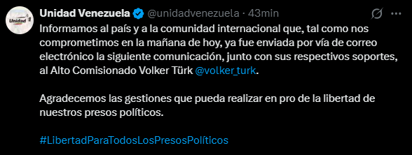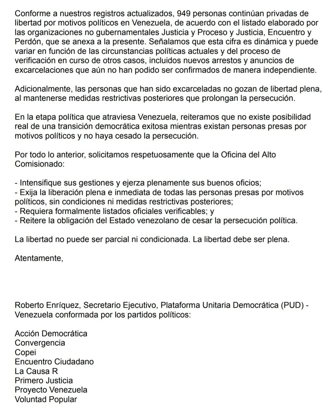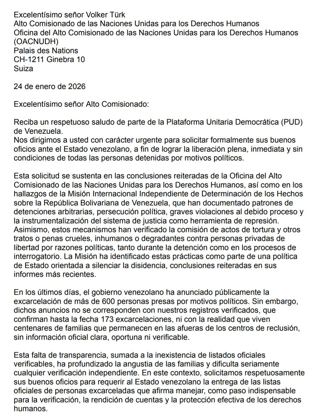 La Plataforma Unitaria Democrática (PUD) informó la tarde de este sábado 24 de enero de 2026 que envió una comunicación formal al Alto Comisionado de las Naciones Unidas para los Derechos Humanos, Volker Türk, en la que expone la situación real de los presos políticos en Venezuela y solicita su intervención para lograr la liberación plena e inmediata de todas las personas detenidas por motivos políticos.