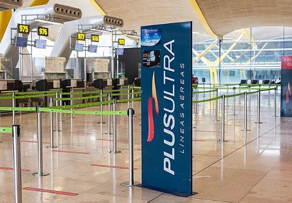 Un panel muestra información sobre vuelos de la aerolínea Plus Ultra. (EP)
