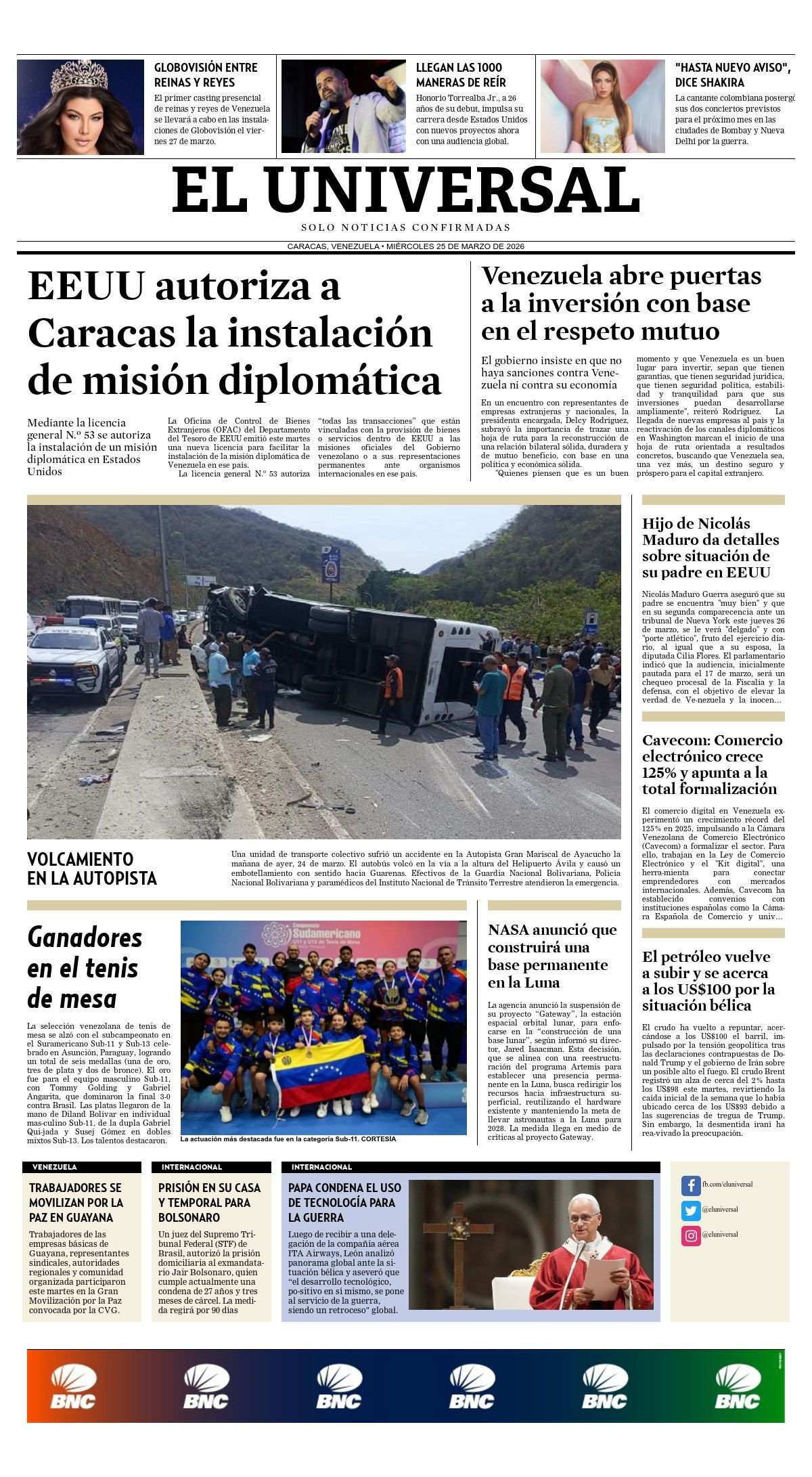 PortadasPortadas de este miércoles 25 de marzo de 2026 Por Prensa venezolanoshoymarzo 25, 202600 Share0