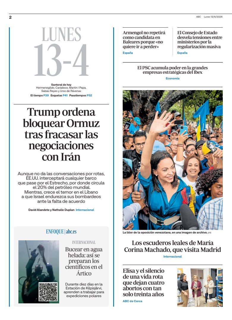 PortadasPortadas de la Prensa InternacionalPortadas de la prensa internacional de este lunes 13 de abril de 2026 Por Prensa venezolanoshoyabril 12, 202600 Share0