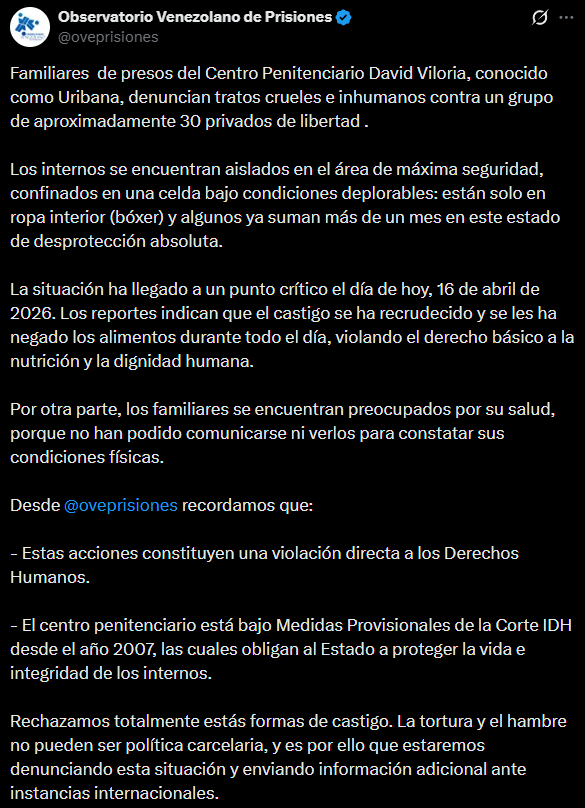 ?La situación ha llegado a un punto crítico el día de hoy, 16 de abril de 2026. Los reportes indican que el castigo se ha recrudecido y se les ha negado los alimentos durante todo el día, violando el derecho básico a la nutrición y la dignidad humana.