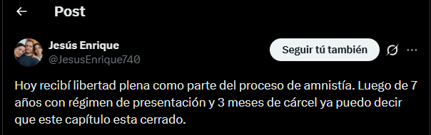 “Hoy recibí libertad plena como parte del proceso de amnistía. Luego de 7 años con régimen de presentación y 3 meses de cárcel ya puedo decir que este capítulo está cerrado”, escribió en su cuenta de X.