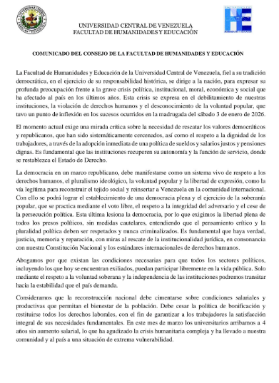 El Consejo de la Facultad de Humanidades y Educación de la Universidad Central de Venezuela (UCV) emitió un comunicado para declarar la «Emergencia Laboral Académica».