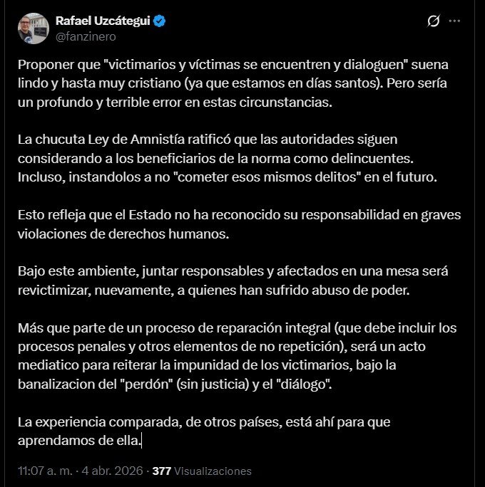 En su mensaje, añadió que un proceso de reparación real debe incluir justicia, garantías de no repetición y responsabilidades penales, advirtiendo que, de lo contrario, cualquier encuentro podría terminar siendo “un acto mediático para reiterar la impunidad de los victimarios”.