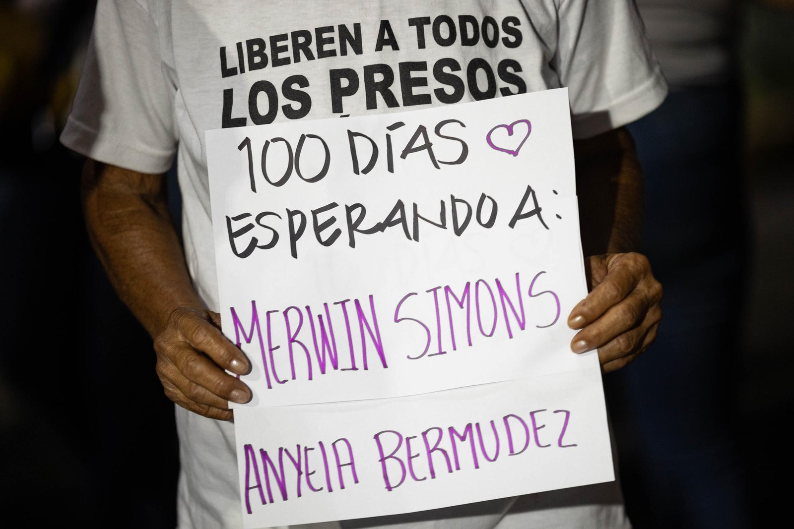 Una persona sostiene un cartel durante una vigilia este sábado, afuera de la cárcel El Rodeo I en Guatire (Venezuela). Familiares de presos políticos cumplieron 100 días de vigilias frente a cárceles de Venezuela, donde esperan la libertad de sus parientes en medio del proceso de amnistía comenzado en febrero. EFE/ Ronald Peña R