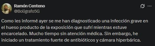A través de una publicación en su de X, Centeno explicó que el diagnóstico se produjo recientemente y que la afección estaría relacionada con las condiciones a las que estuvo expuesto mientras estuvo detenido, así como al prolongado período sin recibir asistencia adecuada.