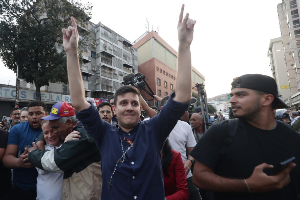 El exconsejal Jesús Armas (c) participan en una manifestación tras ser excarcelado este domingo, en Caracas (Venezuela). EFE/ Ronald Peña R